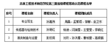 近日,吉林省教育厅公布了全省本科高校第三批课程思政示范课程名单,我校《专业写生》《传感器与检测技术》《酒类制造与运营》3门课程成功入选。具体名单详见下表。
